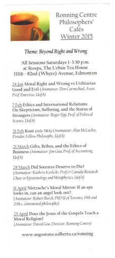 - Single-paged leaflet advertising the upcoming schedule for the Philosophers' Cafes at the Ronning Centre.